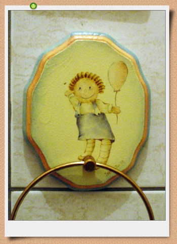 畫不下的娃娃,加上手拉著的氣球,變成另一件作品畫在毛巾架上。